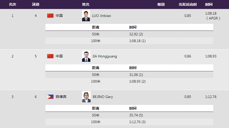 在10月23日结束的杭州亚残运会游泳男子100米自由泳S6决赛中,中国选手发挥出色,包揽冠亚军。罗锦彪以1:08.18的成绩率先冲过终点线,摘得金牌,这一成绩同时打破亚残运会纪录;贾红光紧随其后,收获银牌。